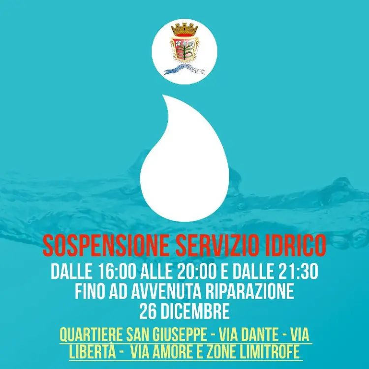 🔴 COMUNICAZIONE IMPORTANTE🔴 💦 CHIUSURA SERVIZIO IDRICO 💦 ⚠️ Quartiere San Giuseppe , Via Liberta e zone limitrofe, Via Dante e zone limitrofe, Via Amore e zone limitrofe 🗓️ in data 26 Dicembre dalle ore 16:30 alle 20:00 e dalle 21:30 fino ad avvenuta riparazione A causa di un importante guasto alla
